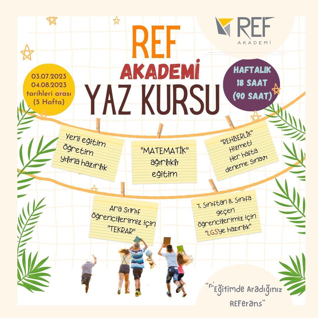 REF Akademi yaz kursuyla hem yazı değerlendirin hem de gelecek eğitim-öğretim yılına hazırlanın. Haftalık 18 saat ders programımızda matematik ağırlıklı eğitim yapılacaktır. (6 saat matematik, 4 saat Türkçe, 4 saat fen bilimleri, 2 saat sosyal bilgiler, 2 saat İngilizce) Her hafta kazanım değerlendirme sınavıyla öğrencilerin bireysel anlamda eksikleri tespit edilerek gerekli çalışmalar yapılacaktır.